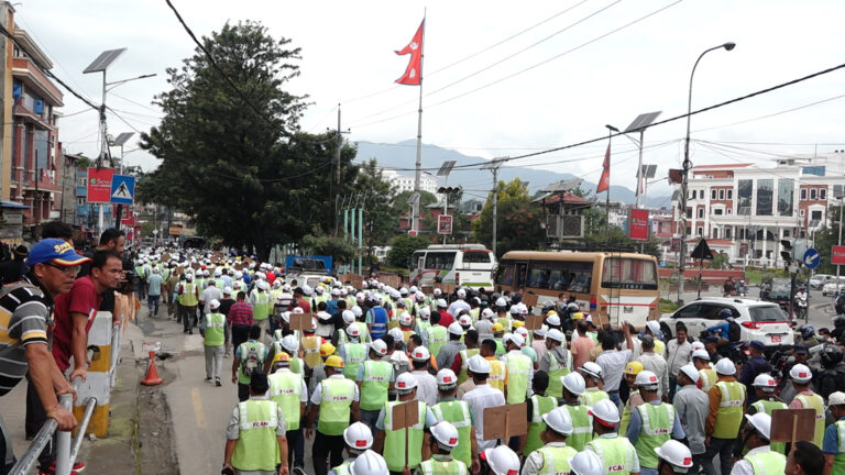 नेपाल निर्माण व्यवसायी महासंघले भुक्तानी, म्याद थप लगायतका नौ बुँदे माग राख्दै विरोध प्रदर्शन गरेको छ । महासंघले बुधबार काठमाडौंमा सेफ्टी हेल्मेट र ज्याकेट लगाई हातमा कालो पट्टी बाँधेर विरोध प्रदर्शन गरेका हुन् ।