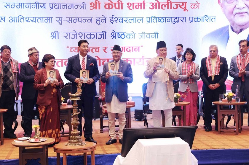 काठमाडौँ । व्यवसायी तथा समाजसेवी राजेशकाजी श्रेष्ठको जीवनीमा आधारित ‘व्यक्तित्व योगदान’ पुस्तकको आज लोकार्पण गरिएको छ । प्रधानमन्त्री केपी शर्मा ओलीले पुस्तकको लोकार्पण गरेका हुन् । त्बतब