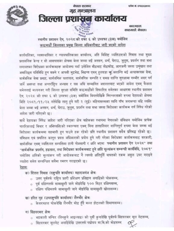 सूचनामा भनिएको छ, ‘मिति २०८१/११/२५ गतेदेखि लागु हुने गरी २ (दुई) महिनासम्मका लागि पाँचजनाभन्दा बढी व्यक्ति भेला/जम्मा भई अनशन, धर्ना, घेराउ, जुलुस, प्रदर्शन तथा सभाजस्ता विरोधका कार्यक्रम गर्न निषेध गरेको आदेश जारी गरिएको छ।’