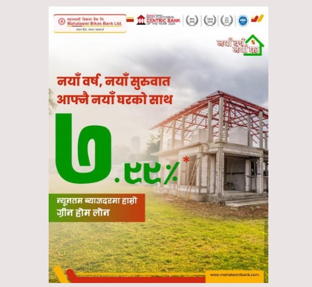 काठमाडौँ । महालक्ष्मी विकास बैंकले नयाँ वर्ष २०८२ को अवसरमा ग्राहकहरुलाई लक्षित गरी महालक्ष्मी घर कर्जा एकल अंकको ब्याजदर ७.९९ प्रतिशतमा नै प्रदान गर्ने भएको छ ।