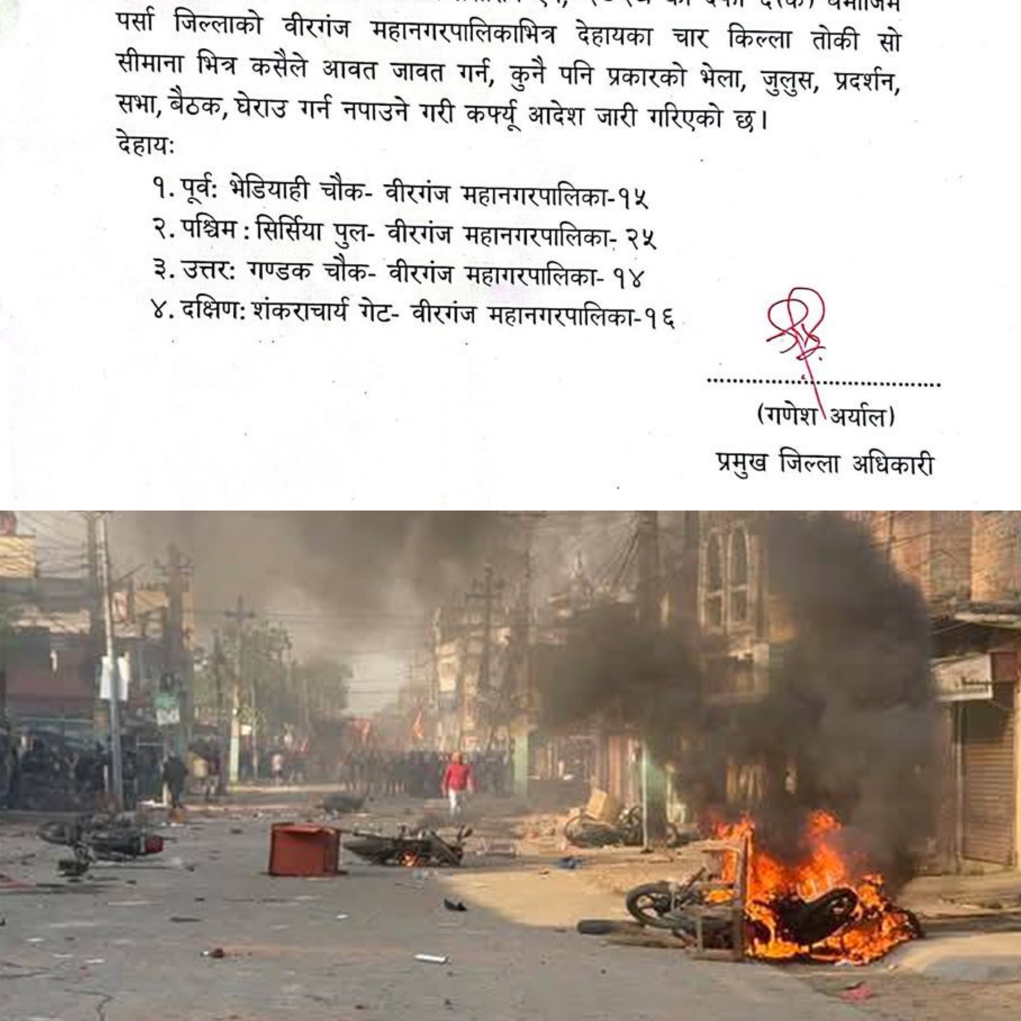 “मिति २०८१/१२/३० गते साँझ ६ः३० बजेदेखि मिति २०८१ / १२/३१ गते दिनको १२ बजेसम्म स्थानीय प्रशासन ऐन, २०२८ को दफा ६ (क) बमोजिम पर्सा जिल्लाको वीरगन्ज महानगरपालिकाभित्र देहायका चार किल्ला तोकी सो सिमानाभित्र कसैले आवतजावत गर्न, कुनै पनि प्रकारको भेला, जुलुस, प्रदर्शन, सभा, बैठक, घेराउ गर्न नपाउने गरी कर्फ्यु आदेश जारी गरिएको छ,” आदेशमा उल्लेख छ ।