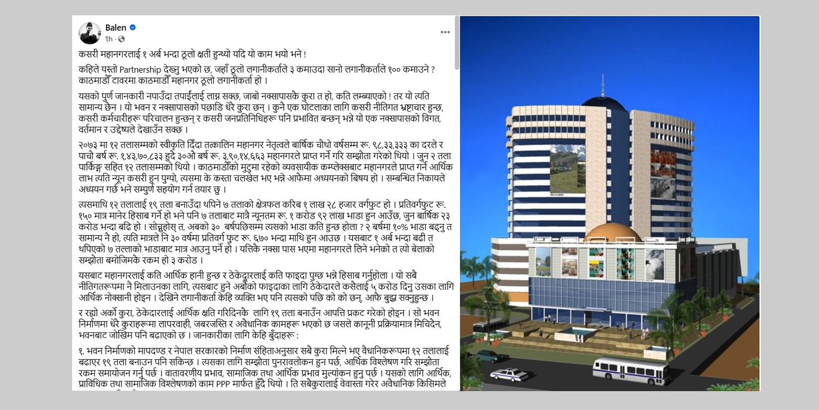 बिहीबार सामाजिक सञ्जालमा बालेनले पूर्वस्वीकृतिभन्दा थपिएका सात तल्लाको भाडा १ अर्ब रहेको र जसको यत्तिकै नक्सापास भए महानगरलाई क्षति हुने उल्लेख गरेका छन् ।