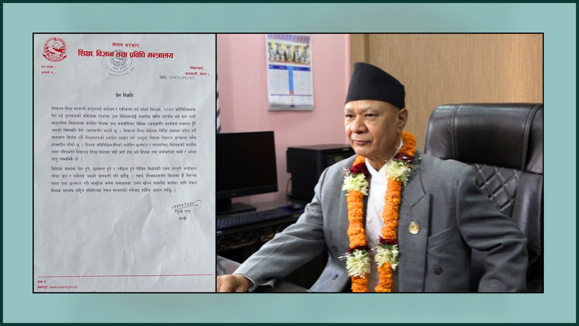 विद्यालय शिक्षा सम्वन्धी कानूनलाई संशोधन र एकीकरण गर्न बनेको विधेयक, २०८० प्रतिनिधिसभामा पेश भई छलफलको प्रक्रियामा रहेकोमा उक्त विधेयकलाई यथाशीघ्र पारित गरियोस् भन्ने माग राख्दै सामुदायिक विद्यालयमा कार्यरत शिक्षक तथा कमर्चारीबाट विभिन्न ध्यानाकर्षण कार्यक्रम सञ्चालन हुँदै आएको विषयप्रति ध्यानाकर्षण भएको पनि उनको भनाई छ ।