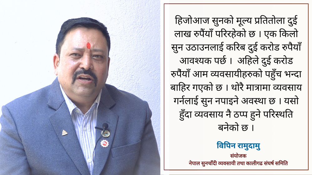 बैंकमा सुन थुप्रिएको छ । तर बैंकले व्यवसायीलाई जति चाहिएको हो त्यति दिन सक्दैन । जसरी व्यवसायीलाई पाँच तोला सुन चाहेको छ भने बैंकले पाँच तोला दिँदैन । एक किलो दिन्छ । तर अहिले एक किलोको मूल्य दुई करोड रुपैंयाँको हाराहारी पर्छ । सुनको मूल्य चारपाँच हजारले घटबढ हुँदा व्यवसायीलाई चारपाँच लाख घाटा हुन्छ । पाँच तोला सुनको लागि पाँल लाख घाटा खायो भने एउटा व्यवसायीले कति चाँही नाफा कमाउन सक्छ ? यो हाम्रो प्रश्न हो । कुनैपनि व्यवसायी घाटा खाने स्थिति काम गर्न सक्दैन । त्यसैले सानो परिणाममा पनि सुन प्राप्त भयो भने व्यवसायीको लागि राम्रो हुन्छ । कच्चा पदार्थ वितरण गर्ने प्रविधि राष्ट्र बैंकको कार्यविधिमा पनि छ । तर कार्यविधिमा भए पनि त्यो विधि कार्यान्वयनमा आएको छैन । यही कार्यान्वयनमा ल्याउनको लागि संघर्ष समितिमा छलफल गर्दैछौं ।
