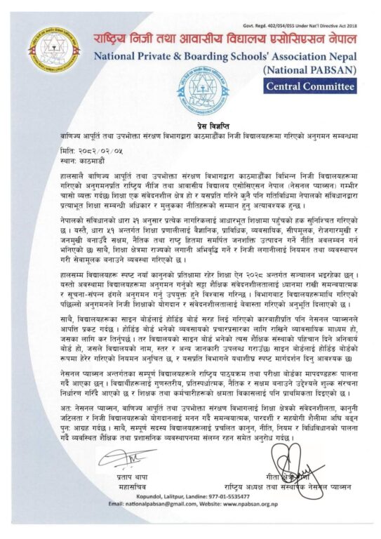 काठमाडौँ । वाणिज्य आपूर्ति तथा उपभोक्ता संरक्षण विभागले काठमाडौँका विभिन्न निजी विद्यालयमा हालै गरेको अनुगमनप्रति राष्ट्रिय निजी तथा आवासीय विद्यालय एसोसिएसन नेपाल (नेसनल प्याब्सन)ले आपत्ति जनाएको छ ।