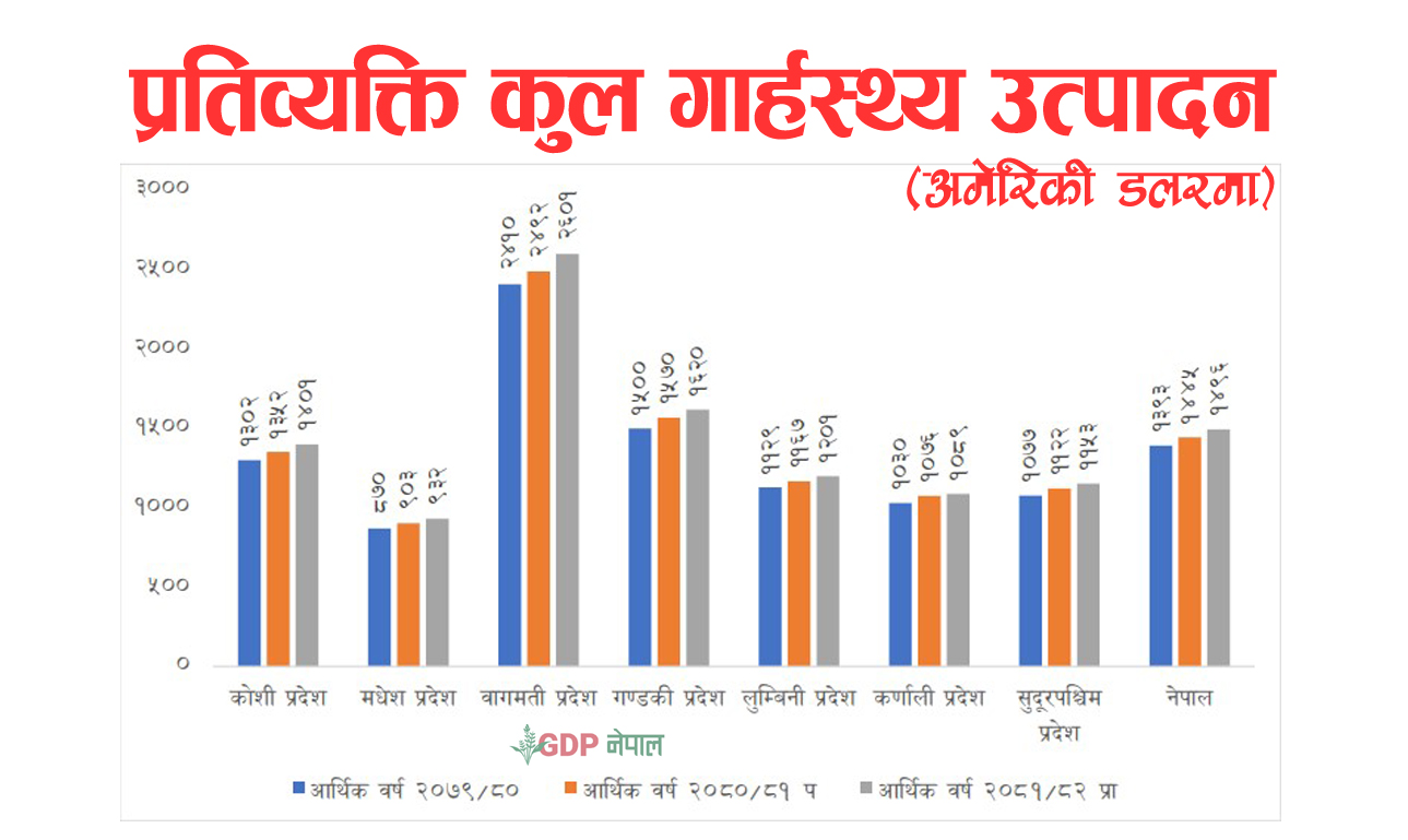 आर्थिक वर्ष २०८१/८२ मा प्रतिव्यक्ति कुल गार्हस्थ्य उत्पादन सबैभन्दा धेरै बागमती प्रदेशको र सबैभन्दा कम मधेश प्रदेशको हुने प्रारम्भिक अनुमान रहेको कार्यालयले जनाएको छ ।