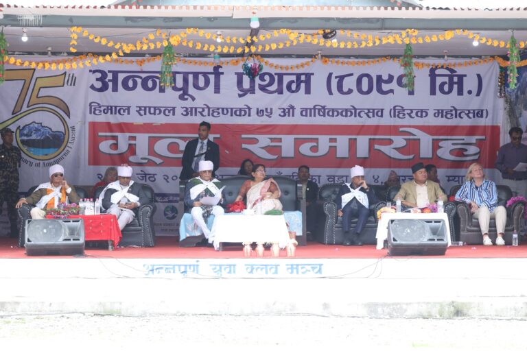 अन्नपूर्ण हिमाल आरोहणको हीरक महोत्सवका अवसरमा मंगलबार अन्नपूर्ण गाउँपालिकाले अन्नपूर्ण गाउँपालिका–४ नारच्याङमा आयोजना गरेको समारोहमा प्रधानमन्त्री ओलीले हिमाल आरोहणको जोखिम घटाउन सरकारले काम गरिरहेको बताए ।