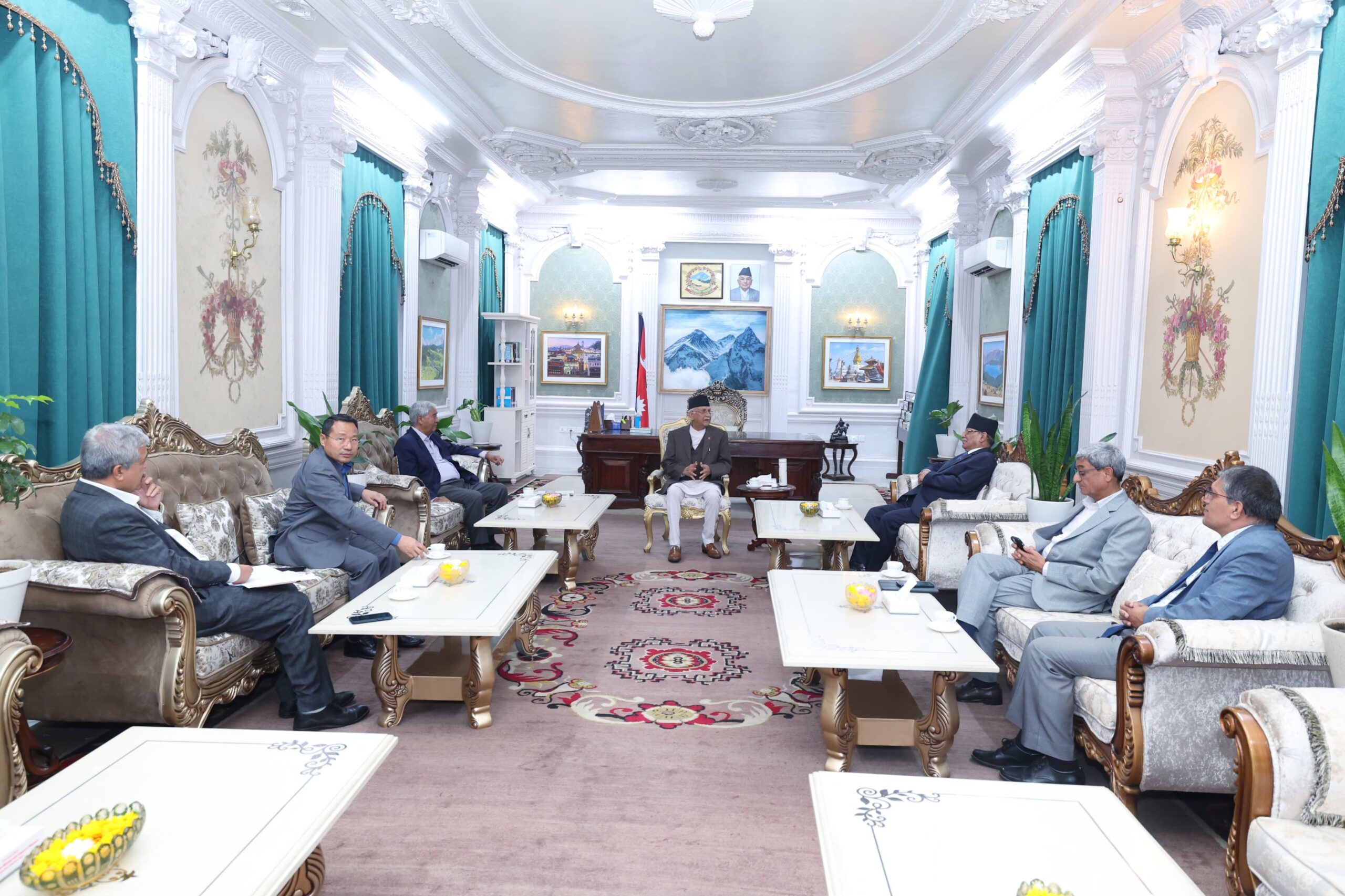 प्रधानमन्त्री तथा मन्त्रिरिषद्को कार्यालय, सिंहदरबारमा जारी बैठकमा प्रधानमन्त्री एवं नेकपा ९एमाले०का अध्यक्ष ओली, नेपाली काँग्रेसका सभापति एवं पूर्व प्रधानमन्त्री शेरबहादुर देउवा, नेकपा ९माओवादी केन्द्र० का अध्यक्ष एवं पूर्व प्रधानमन्त्री पुुष्पकमल दाहाल ‘प्रचण्ड’ लगायत नेताहरु सहभागी रहेका छन् ।