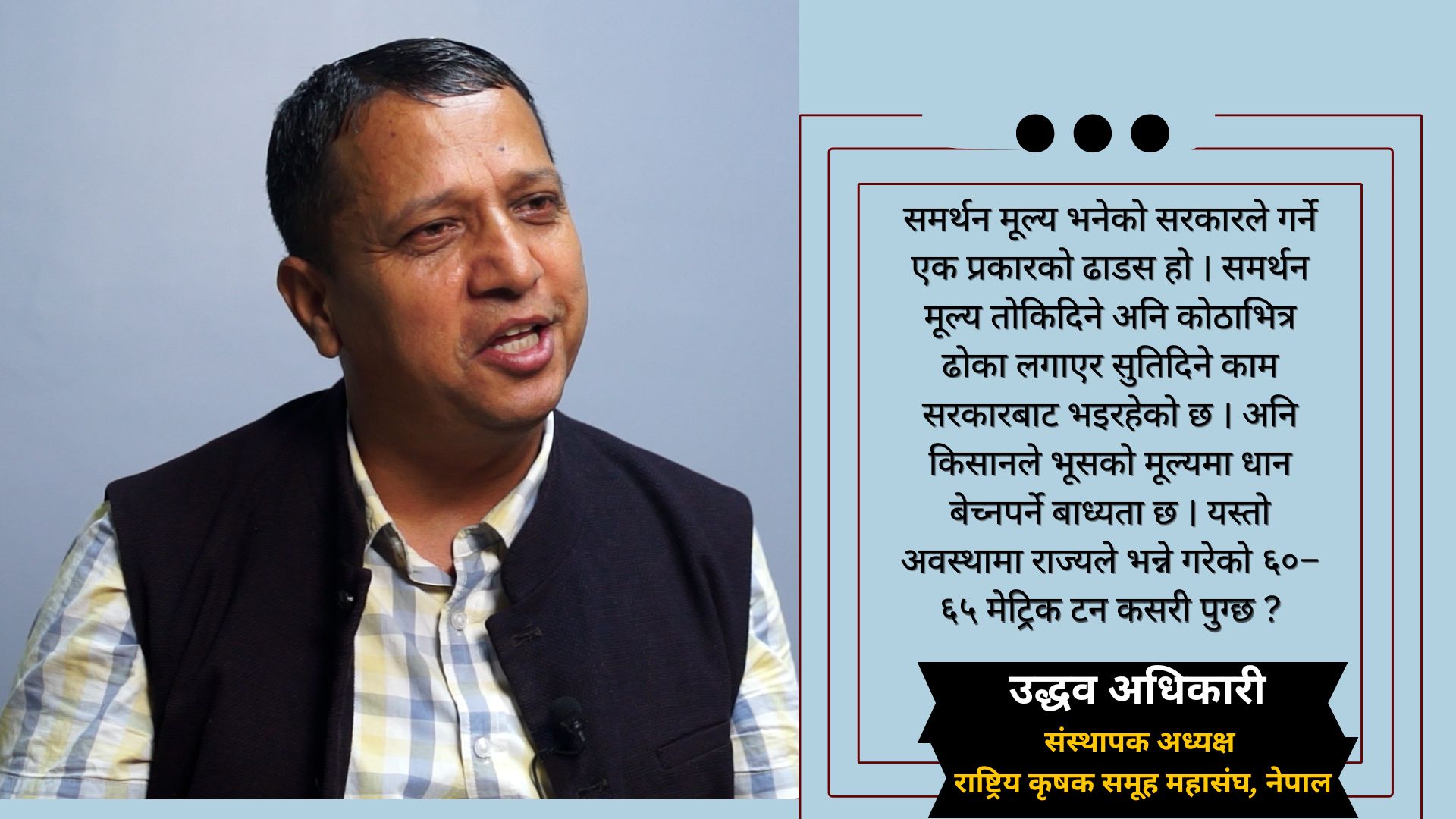 समर्थन मूल्य भनेको सरकारले गर्ने एक प्रकारको ढाडस हो । समर्थन मूल्य तोकिदिने अनि कोठाभित्र ढोका लगाएर सुतिदिने काम सरकारबाट भइरहेको छ । अनि किसानले भूसको मूल्यमा धान बेच्नपर्ने बाध्यता छ । यस्तो अवस्थामा राज्यले भन्ने गरेको ६०–६५ मेट्रिक टन कसरी पुग्छ ?