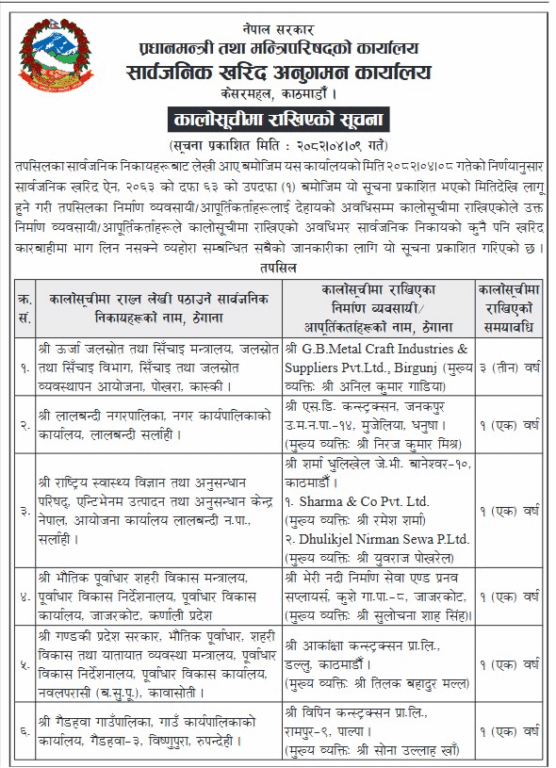 कार्यालयले आज सूचना जारी गर्दै विभिन्न निकायबाट कालो सूचीमा राख्नको लागि लेखि पठाएअनुसार ती निर्माण कम्पनीलाई कालो सूचीमा राखिएको जानकारी दिएको हो ।