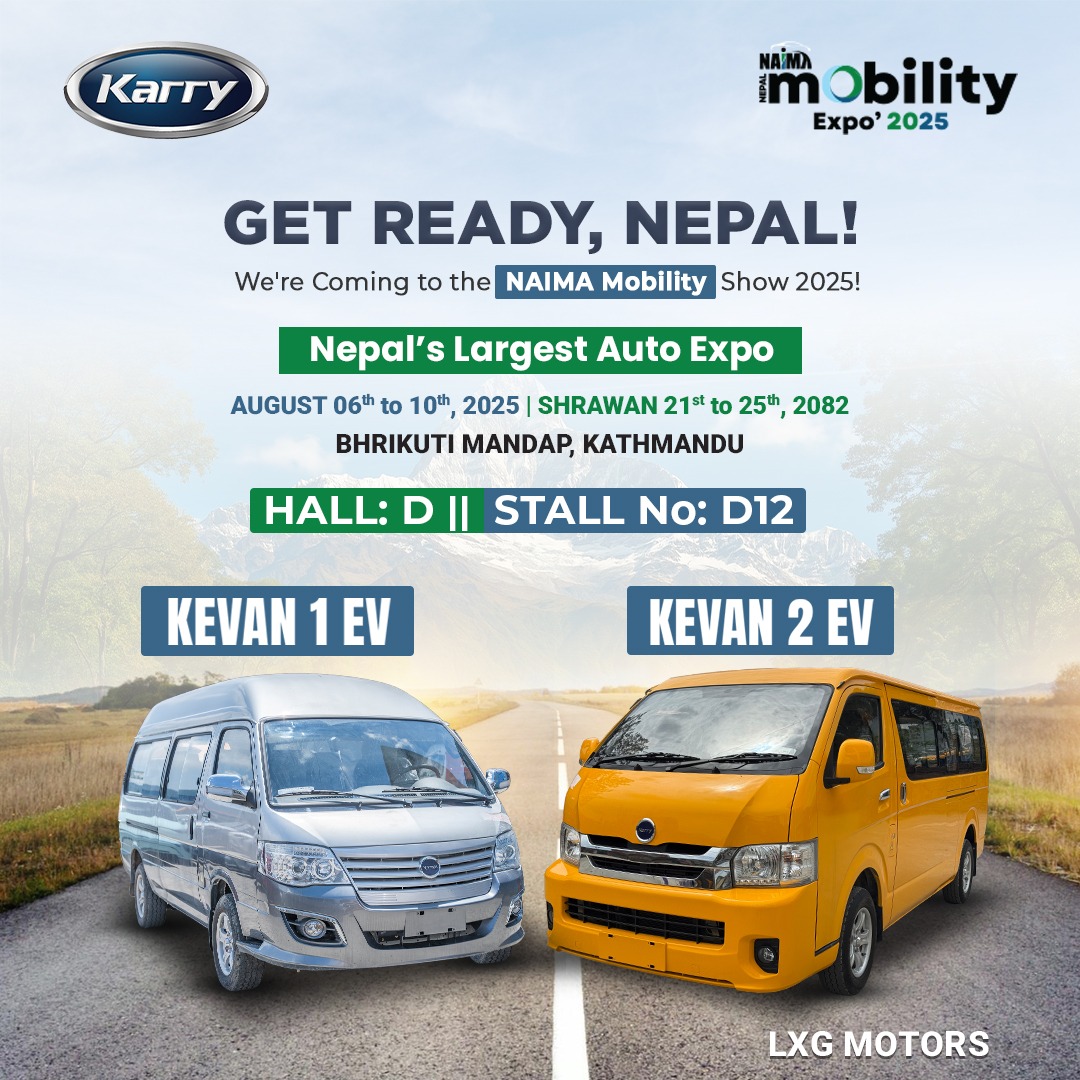 साउन २१ गतेदेखि सञ्चालन हुने नेपाल अटोमोबाइल ईपोर्टर्स एन्ड म्यानुफ्याक्चरर्स एशोसिएसन (नाइमा) द्वारा आयोजित ‘नाइमा मोबिलिटी एक्सपो २०२५’ मार्फत ‘क्यारी’ ब्रान्डका दुई नयाँ विद्युतीय भ्यानहरू सार्वजनिक हुने भएका हुन् ।