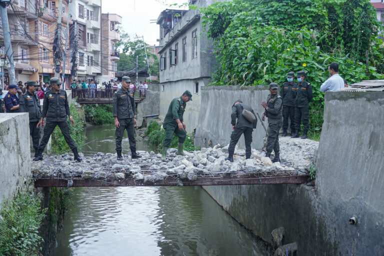 काठमाडौं । काठमाडौं महानगरपालिकाले वडा नम्बर १३ र १४ स्थित कालीमाटी र कुलेश्वर क्षेत्रमा स्थानीयले बनाएका पुल भत्काएको छ ।