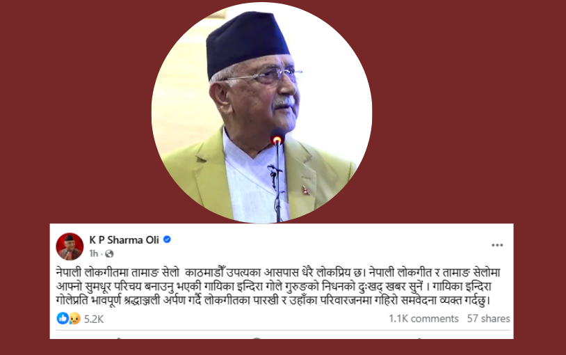 बिहीबार सामाजिक सञ्जालमा लेख्दै प्रधानमन्त्री ओलीले नेपाली लोकगीत र तामाङ सेलोमा आफ्नो सुमधूर परिचय बनाउन सफल गायिका इन्दिरा गुरुङको निधनले दुखी लुल्याएको बताए ।