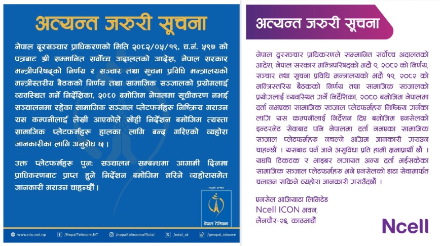 ‘नेपाल दूरसञ्चार प्राधिकरणको मिति २०८२/०५/१९, च.नं. ५९७ को पत्रबाट श्री सम्मानित सर्वोच्च अदालतको आदेश, नेपाल सरकार मन्त्रिपरिषदको निर्णय र सञ्चार तथा सूचना प्रविधि मन्त्रालयको मन्त्रिस्तरीय बैठकको निर्णय तथा सामाजिक सञ्जालको प्रयोगलाई व्यवस्थित गर्ने निर्देशिका, २०८० बमोजिम नेपालमा सूचीकरण नभई सञ्चालनमा रहेका सामाजिक सञ्जाल प्लेटफर्महरू निष्क्रिय गराउन यस कम्पनीलाई लेखी आएकाले सोही निर्देशन बमोजिम त्यस्ता सामाजिक प्लेटफर्महरू हालका लागि बन्द गरिएको व्यहोरा जानकारीका लागि अनुरोध छ,’ टेलिकमले भनेको छ ।