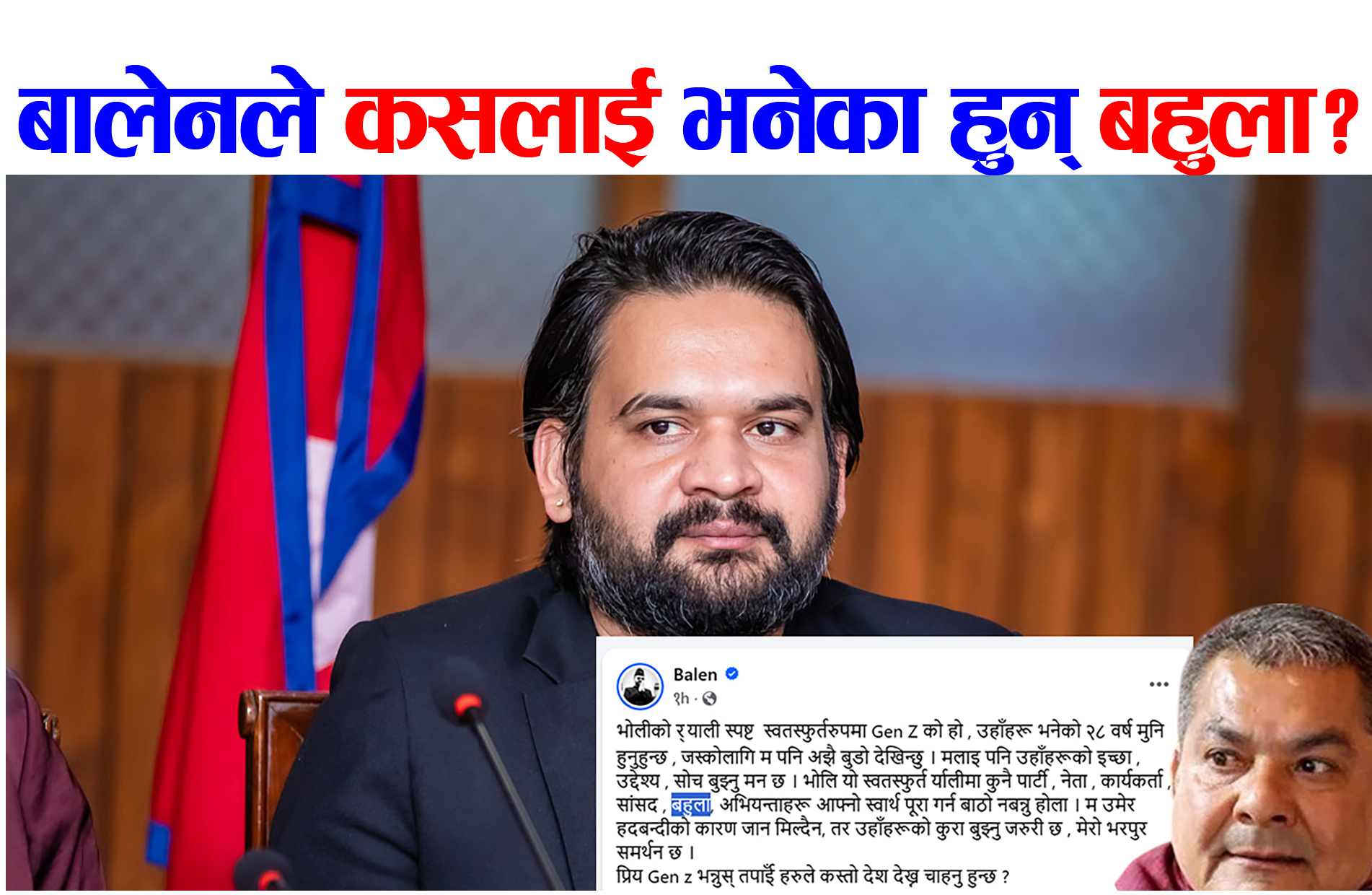 ‘भोलिको ¥याली स्पष्ट स्वस्फूर्त रुपमा जेनजीको हो , उहाँहरू भनेको २८ वर्ष मुनि हुनुहुन्छ, जसका लागि म पनि अझै बुढो देखिन्छु । मलाई पनि उहाँहरूको इच्छा, उद्देश्य, सोच बुझ्न मन छ’ बालेनले भनेका छन्, ‘भोलि यो स्वस्फूर्त ¥यालीमा कुनै पार्टी, नेता, कार्यकर्ता, सांसद, बहुला, अभियन्ताहरू आफ्नो स्वार्थ पूरा गर्न बाठो नबन्नुहोला ! म उमेर हदको कारण जान मिलेन, तर उहाँहरूको कुरा बुझ्न जरुरी छ, मेरो भरपूर समर्थन छ ।’