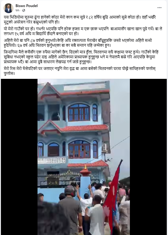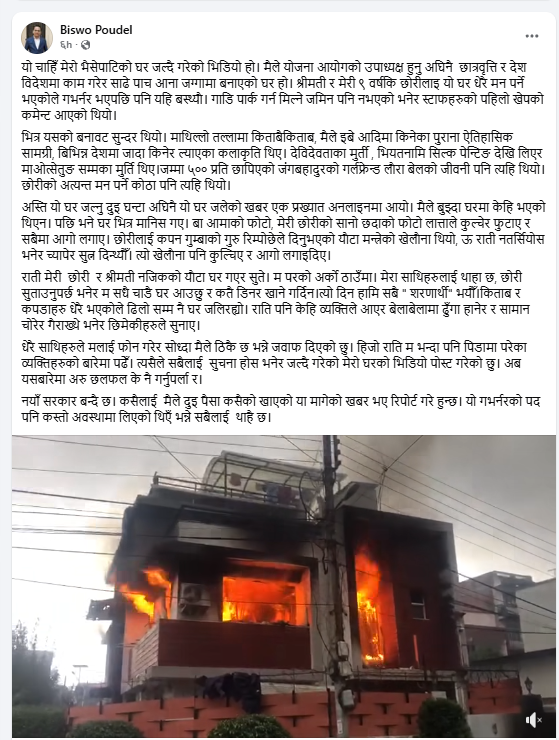 “अस्ति यो घर जल्नु दुइ घन्टा अघिनै यो घर जलेको खबर एक प्रख्यात अनलाइनमा आयो,” उनले बिहीबार लेखेका छन्, “मैले बुझ्दा घरमा केहि भएको थिएन। पछि भने घर भित्र मानिस गए । बा आमाको फोटो, मेरी छोरीको सानो छँदाको फोटो लात्ताले कुल्चेर फुटाए र सबैमा आगो लगाए ।”