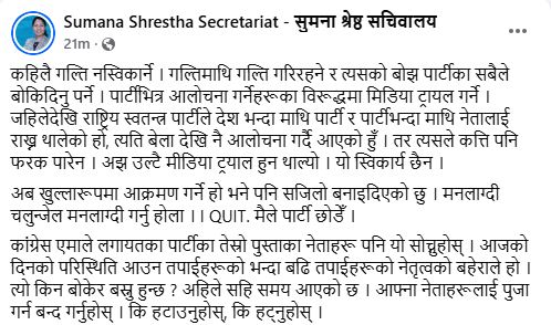 उनले लेखेकी छिन,‘कहिलै गल्ति नस्वीकार्ने । गल्तिमाथि गल्ति गरिरहने र त्यसको बोझ पार्टीका सबैले बोकिदिनु पर्ने । पार्टीभित्र आलोचना गर्नेहरूका विरूद्धमा मिडिया ट्रायल गर्ने । जहिलेदेखि राष्ट्रिय स्वतन्त्र पार्टीले देश भन्दा माथि पार्टी र पार्टीभन्दा माथि नेतालाई राख्न थालेको हो, त्यति बेला देखि नै आलोचना गर्दै आएको हुँ । तर त्यसले कत्ति पनि फरक पारेन ।