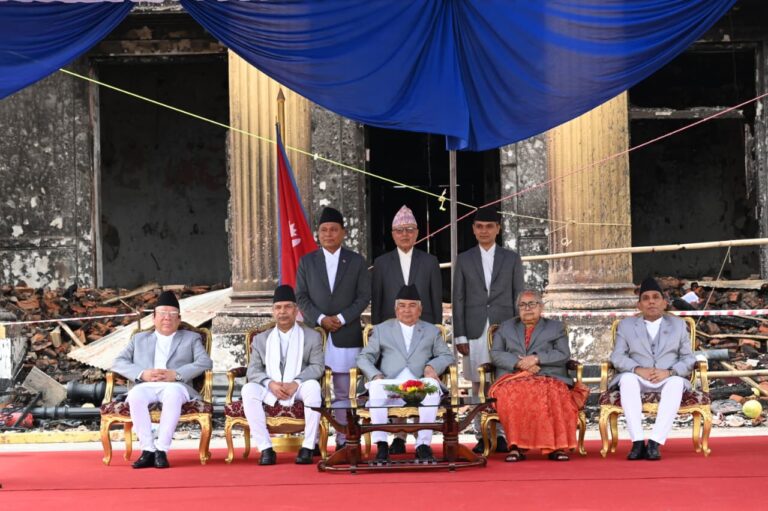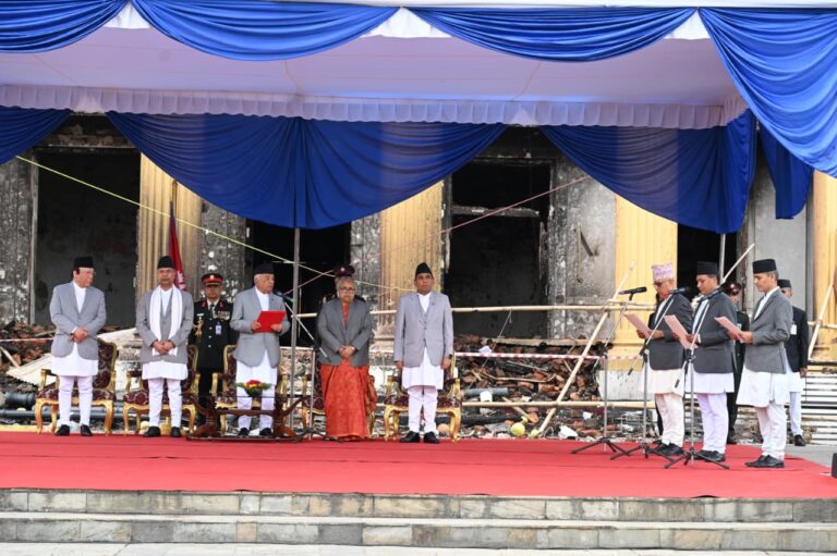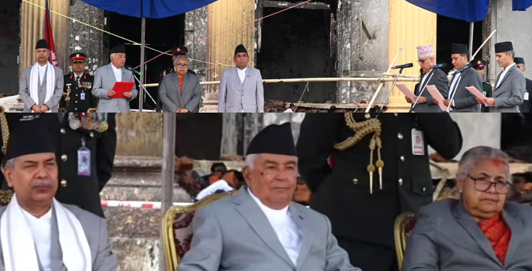 काठमाडौं । जेनजी आन्दोलनका नाउँमा जलाइएको राष्ट्रपति भवन शितल निवासमा सोमबार मन्त्रीहरुको सपथ ग्रहण कार्यक्रम आयोजना गरियो ।