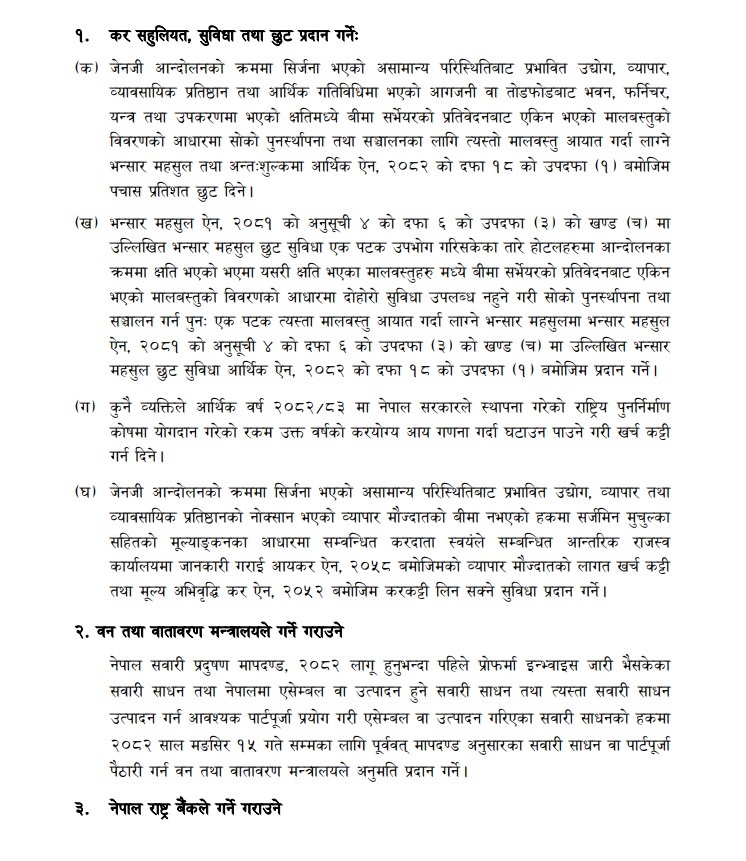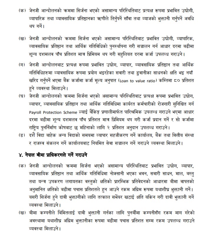 जेनेजी आन्दोलनका कारण उद्योग, व्यापार र व्यवसायिक प्रतिष्ठानमा परेको क्षतिलाई सम्बोधन गर्न सरकारले कर छुट, बीमा भुक्तानी तथा कर्जा सहुलियत दिने व्यवस्था मिलाएको छ।