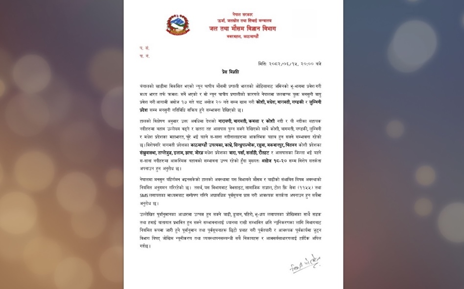 विभागले बुधबार विज्ञप्ति जारी गर्दै कोसी, मधेस, वाग्मती, गण्डकी र लुम्बिनी प्रदेशसम्म मनसुनी गतिविधि सक्रिय हुने सम्भावना देखिएको जनाएको हो ।
