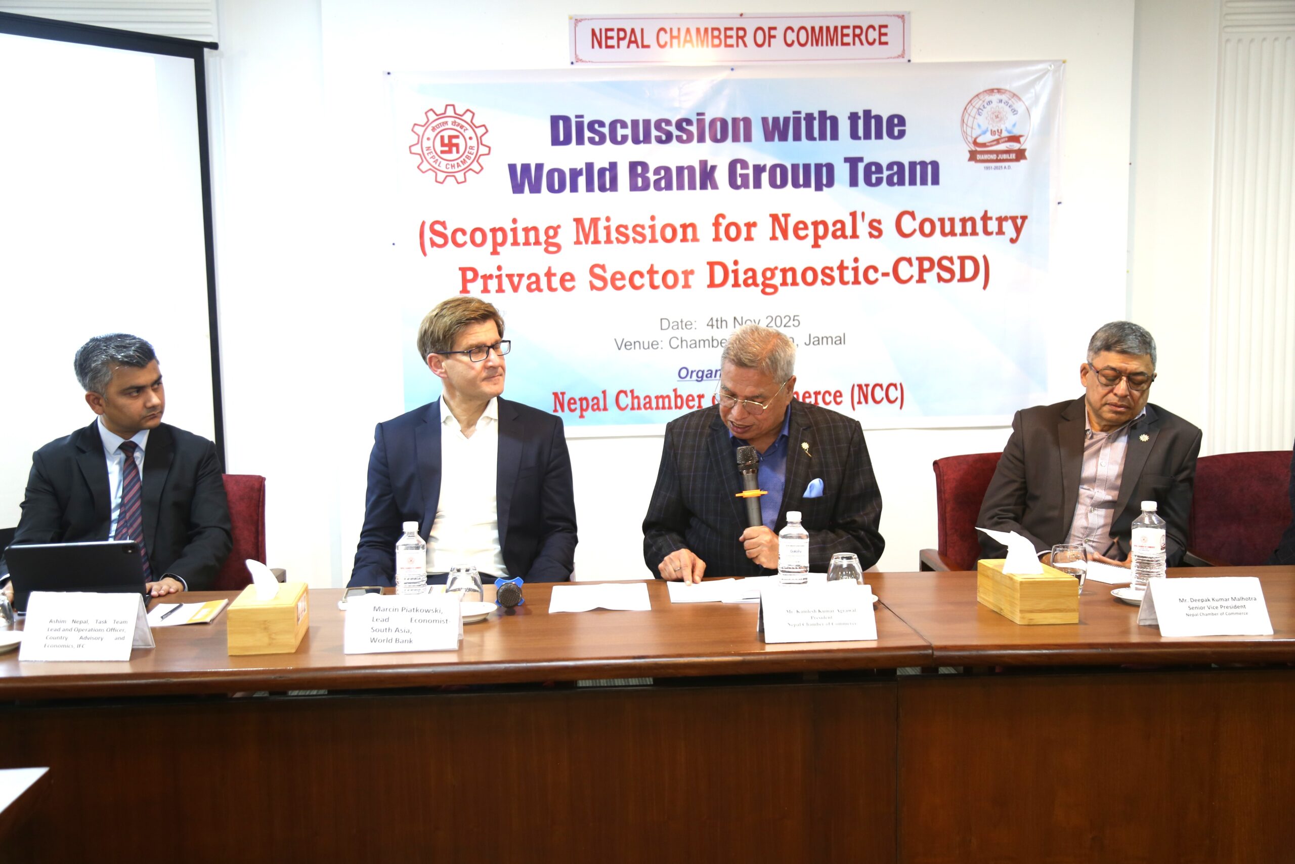 काठमाडौंको जमलस्थित चेम्बर भवनमा अयोजित कार्यक्रममा चेम्बरका अध्यक्ष कमलेश कुमार अग्रवाल, पदाधिकारी, विभिन्न समितिका सभापति तथा उद्योगी–व्यवसायीहरु एवं विश्व बैंक समूहका साउथ एसिया लिड इकोनोमिस्ट मर्चिन पियाट्कोस्की नेतृत्वको टोलीले सहभागिता जनाएको थियो ।