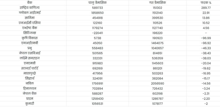 काठमाडौं । चालु आर्थिक वर्षको पहिलो त्रैमासमा २० वटा वाणिज्य बैंकहरूले १३ अर्ब १४ करोड ९८ लाख रुपैयाँ खुद नाफा कमाएका छन् । गत आर्थिक वर्षको सोही अवधिको तुलनामा बैंकहरको नाफा १८ प्रतिशतले घटेको हो । गत आवको पहिलो तीन महिनामा वाणिज्य बैंकहरुले १६ अर्ब १८ करोड खुद नाफा आर्जन गरेका थिए ।