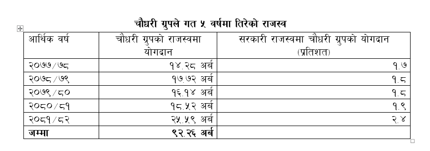 यो संगै गत पाँच वर्षमा चौधरी ग्रुपले सरकारलाई ९२ अर्ब २६ करोड रुपैयाँ कर तिरेको छ । कमजोर आर्थिक गतिविधि, आयात–निर्भर बजार, नीतिगत अस्थिरता तथा निजी लगानीमा आएका बाधाका बाबजुद पनि चौधरी ग्रुपले निरन्तर करमा वृद्धि गर्दै आएको छ । यसले राष्ट्रका विकास योजनाहरू, सामाजिक सुरक्षा, पूर्वाधार निर्माण तथा सार्वजनिक सेवाका क्षेत्रमा राज्यलाई थप आधार प्रदान गर्ने चौधरी ग्रुपले विश्वास लिएको छ ।