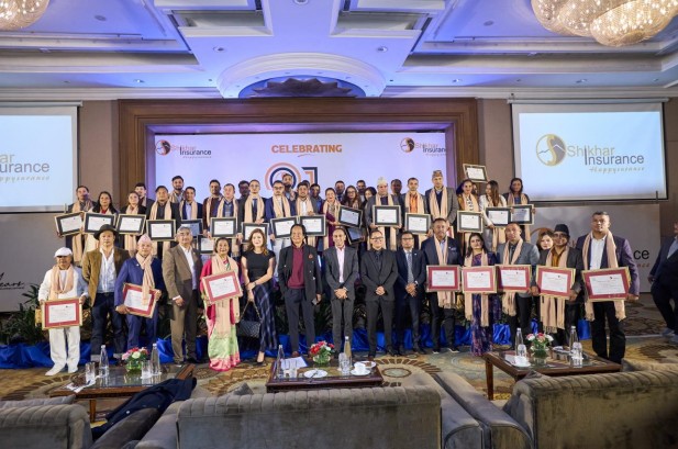काठमाडौँ । शिखर इन्स्योरेन्स कम्पनी लिमिटेडको २१औं वार्षिकोत्सव सम्पन्न भएको छ । सो अवसरमा कम्पनीले २० वर्ष सेवा अवधि पुरा गरेका ११ जना कर्मचारीलाई सुनको सिक्का र १० वर्ष सेवा अवधि पूरा गरेका ३० जना कर्मचारीहरूलाई चाँदीको सिक्का सहित प्रमाणपत्र प्रदान गरेको छ ।