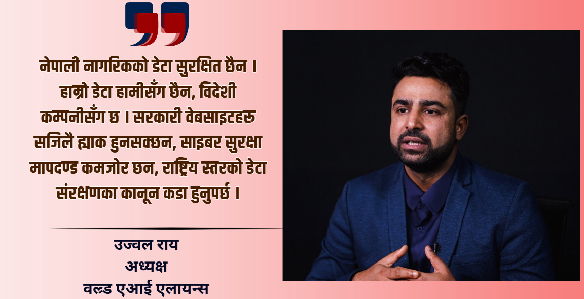 यही सन्दर्भमा वल्र्ड एआई एलायन्सका संस्थापक तथा सीईओ तथा न्युयोर्कमा आधारित प्रविधि व्यवसायी उज्वल रायले नेपालमा एआई सम्भावना, आवश्यक पूर्वाधार, नीति, जनशक्ति निर्माण र स्टार्टअप इकोसिस्टमका चुनौती तथा सुधारका दिशाबारे नेपाल न्यूज बैंकसँग विस्तृत कुरा गरेका छन् ।