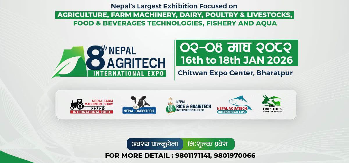मिडिया स्पेस सोलुसन्स प्रालि र फ्युचरेक्स ट्रेड फेयर्स एन्ड इभेन्ट्स् प्रालिले विगतका वर्षहरु झैं यस वर्षपनि कृषि सम्बन्धी बृहत अन्र्तराष्ट्रिय प्रर्दशनी ‘नेपाल एग्रीटेक इन्टरनेशनल एक्स्पो’ हुन लागेको हो ।