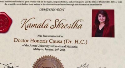 मलेसियामा हालै आयोजित समारोहमा व्यवसायी श्रेष्ठलाई ‘डिग्री अफ डक्टर अनरिज काउजा (डा. एचसी)’ प्रदान गरियो ।
