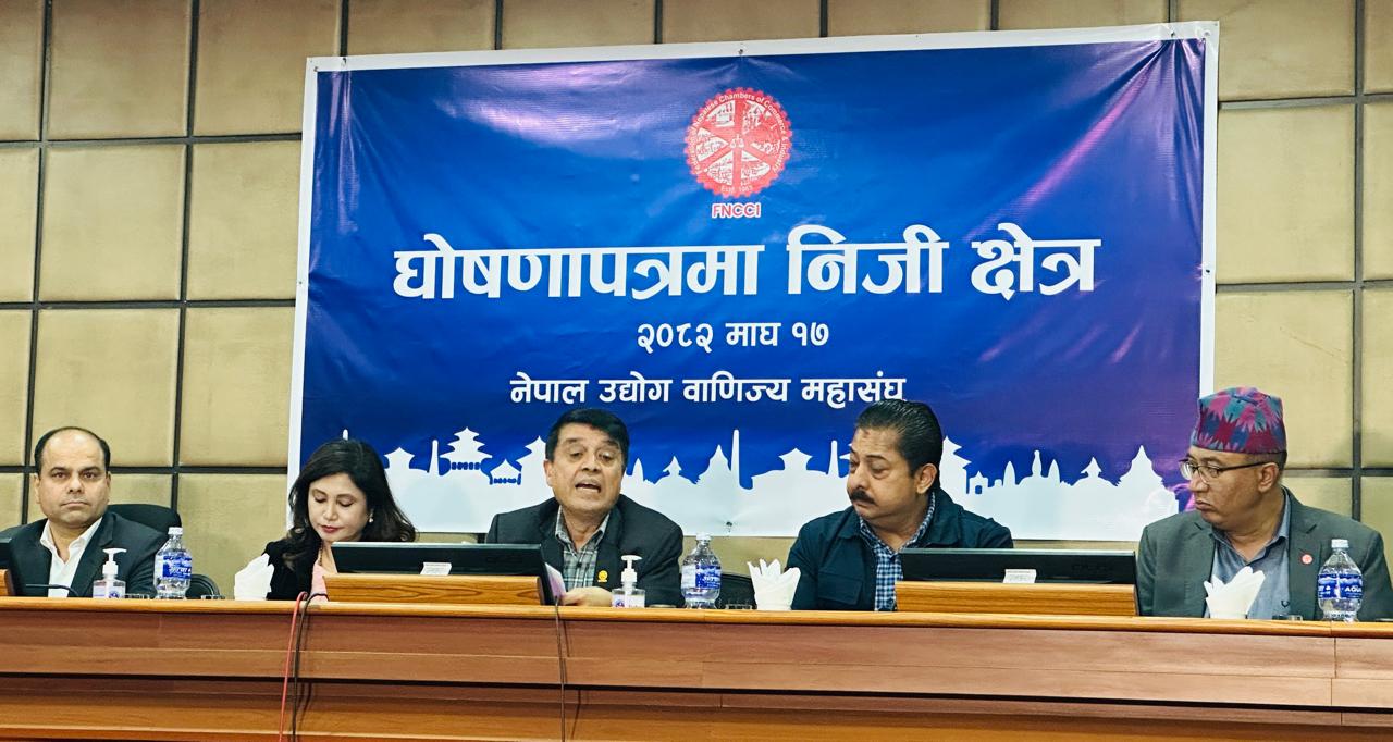 फागुन २१ मा हुने निर्वाचनका लागि राजनीतिक दलका घोषणापत्रमा समावेश गरिनुपर्ने विषयमा १४ बुँदे सुझाव प्रस्तुत गर्दै महासंघले उद्योग व्यवसायलाई शान्ति क्षेत्र घोषणा गर्न माग गरेको हो ।