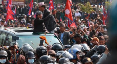झापाबाट हेलिकप्टरमा काठमाडौं फर्किएका शाहलाई त्रिभुवन विमानस्थलमा स्वागत गर्न दुर्गा प्रसाईंसहित ठूलो संख्यामा समर्थक पुगेका थिए ।