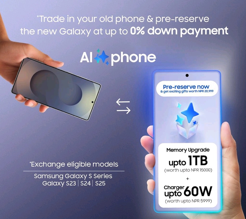 यो एक्सचेन्ज सुविधा विशेषगरी प्रिमियम स्मार्टफोन प्रयोगकर्ताहरूका लागि उपलब्ध गराइएको छ। जसमा सामसङका ग्यालेक्सी एस २३, एस २४ र एस २५ सिरिजका साथै एप्पलका आईफोन १४, १५ र १६ सिरिज (iDevice 14, 15 & 16) का योग्य सेटहरू साट्न सकिने कम्पनीले जनाएको छ। यो ‘ह्यान्ड रेजर’ अफर २३ फेब्रुअरीदेखि २६ फेब्रुअरी २०२६ सम्मका लागि मात्र मान्य हुनेछ। यस अवधिमा ग्राहकहरूले अनलाइन दर्ता गरी आफ्नो योग्य डिभाइस एक्सचेन्ज गरेर नयाँ एआई–पावर्ड स्मार्टफोन आकर्षक मूल्यमा प्रि–रिजर्भ गर्न सक्नेछन्।