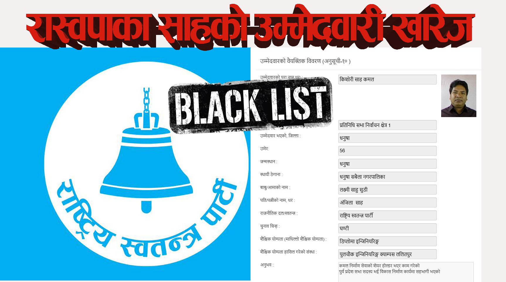 काठमाडौं । धनुषा–१ का राष्ट्रिय स्वतन्त्र पार्टी (रास्वपा)का उमेदवार किशोरी साहको उमेदवारी खारेज भएको छ ।