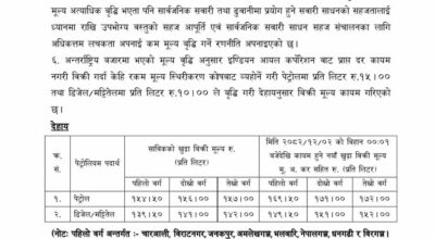 अन्तर्राष्ट्रिय बजारको पछिल्लो लागत मूल्य अनुसार पेट्रोलमा ३१ रुपैयाँ, डिजेलमा ५४ रुपैयाँ र खाना पकाउने ग्यासमा प्रति सिलिण्डर २१६ रुपैयाँसम्म मूल्य बढेर आएको भए तापनि उपभोक्ताको हित र सार्वजनिक सवारी साधनको सहजतालाई ध्यानमा राखेर निगमले मूल्य स्थिरीकरण कोषको प्रयोग गरी न्यून दरमा मात्र मूल्य बढाउने रणनीति लिएको दाबी गरेको छ ।