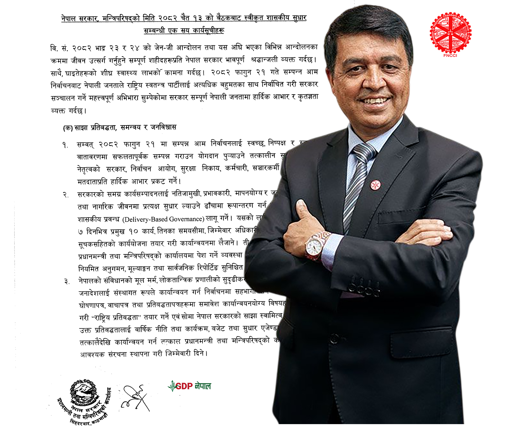 काठमाडौं । नेपाल उद्योग वाणिज्य महासंघको प्रस्तावमा २०८२ चैत १३ गतेको मन्त्रिपरिषद् बैठकले निजी क्षेत्र संरक्षण एवं प्रवर्द्धन रणनीति (पीएसपीपी) तत्काल कार्यान्वयन गर्ने निर्णय गरेको छ ।