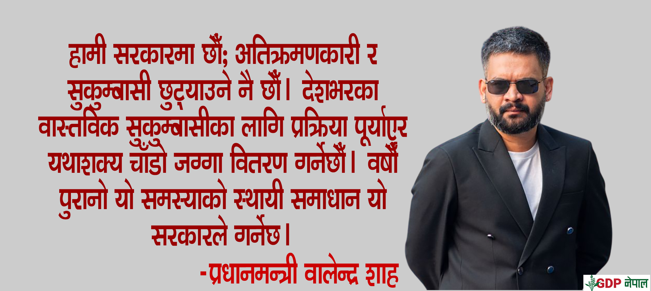 प्रधानमन्त्री शाहले सुकुम्बासी व्यवस्थापन सरकारको प्राथमिकतामा रहेको उल्लेख गर्दै ‘सरकारका १०० काम’ भित्रै यसलाई समेटिएको स्मरण गराए। वास्तविक सुकुम्बासी र अतिक्रमणकारीलाई छुट्याएर देशभरका पीडित परिवारलाई प्रक्रिया पूरा गरी जग्गा उपलब्ध गराउने तयारी भइरहेको उनले बताए।