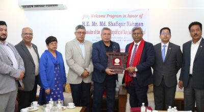 काठमाडौं । नेपाल चेम्बर अफ कमर्सका निवर्तमान अध्यक्ष राजेन्द्र मल्लले लगानी, प्रविधि र पर्यटन क्षेत्रमा सहकार्यका लागि चिनियाा व्यवसायीलाई आग्रह गरेका छन् । चाइनीज जनरल एसोसिएसन अफ इन्डस्ट्रीज एण्ड कमर्सका अध्यक्ष फान जियाओबोसंग भएको भेटवार्तामा निवर्तमान अध्यक्ष मल्लले नेपाल–चीन व्यापारिक सम्बन्धलाई थप सुदृढ र परिणाममुखी बनाउन सहकार्यको प्रस्ताव गरे । भेटका क्रममा निवर्तमान अध्यक्ष मल्लले चीनसँगको…