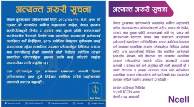काठमाडौं । दूरसञ्चार प्रदायक कम्पनी नेपाल टेलिकम (एनटीसी)ले तीन दिनका लागि भ्वाइस कल र इन्टरनेट सेवा निःशुल्क गरेको छ । हाल देशमा उत्पन्न विषम परिस्थितिलाई मध्यनजर गर्दै एनटीसीले डाटा तथा भ्वाइस सहितको प्याकेज निशुल्क गरेको हो ।बुधबारदेखि प्रत्येक उपभोक्ताहरुलाई सन्देश मार्फत डाटा तथा भ्वाइस सहितको प्याकेज दिएको हो । डाटा लिन स्टार १४१५ स्टार ८…